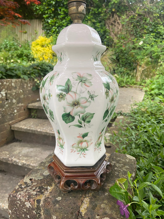 20% OFF AT CHECKOUTRegular price £78.00 GBPRegular priceUnit price / perSale price £78.00 GBP20% OFF AT CHECKOUTGorgeous vintage Ginger Jar, Oriental, Chinese Vintage Table lamp, white with carved wooden base, covered in pretty cherry blossoms