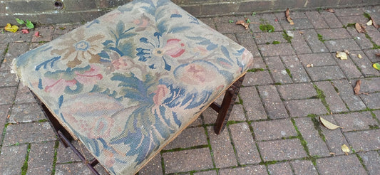 20% OFF AT CHECKOUTRegular price £275.00 GBPRegular priceUnit price / perSale price £275.00 GBP20% OFF AT CHECKOUTAntique Mahogany Stool with Tapestry Seat, Ornate Carved Details & Fretwork Accents – Elegant Vintage Vanity Piece Age Worn