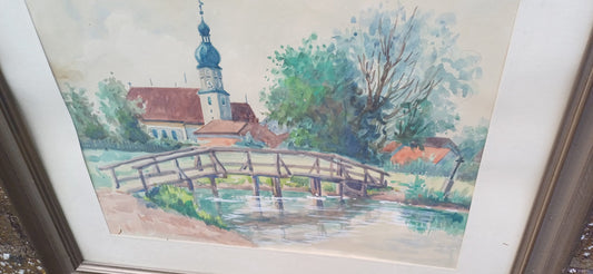 20% OFF AT CHECKOUTRegular price £145.00 GBPRegular priceUnit price / perSale price £145.00 GBP20% OFF AT CHECKOUTVintage watercolour painting, original artwork, European town scene with river in foreground - framed and mounted in vintage glazed frame