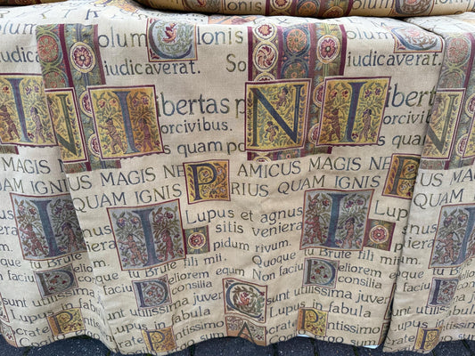 20% OFF AT CHECKOUTRegular price £78.00 GBPRegular priceUnit price / perSale price £78.00 GBP20% OFF AT CHECKOUTSuperb vintage curtains (3 pairs, 6 drops) in quality Latin script fabric, lined and pencil pleats - 178cm drop, 125cm width per drop