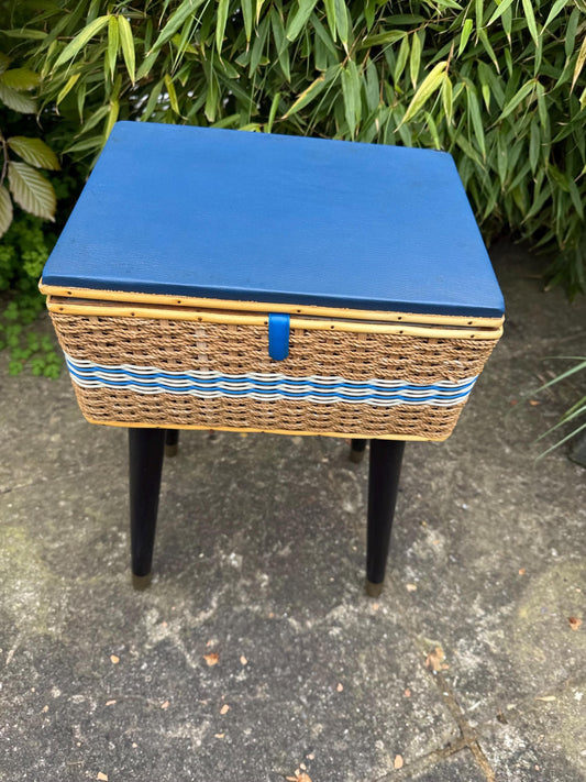 20% OFF AT CHECKOUTRegular price £85.00 GBPRegular priceUnit price / perSale price £85.00 GBP20% OFF AT CHECKOUTVintage mid-century wicker sewing box on metal capped tapered legs, retro craft storage, with blue lid and metal tipped legs, 1950s workbox