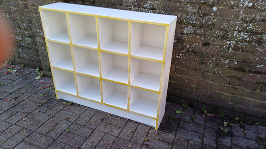 20% OFF AT CHECKOUTRegular price £395.00 GBPRegular priceUnit price / perSale price £395.00 GBP20% OFF AT CHECKOUTVintage Set of Large Painted Cubby Holes Shelves in Farrow and Ball Wimborne White with Gold Highlights.