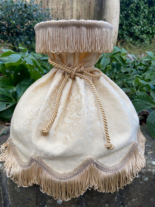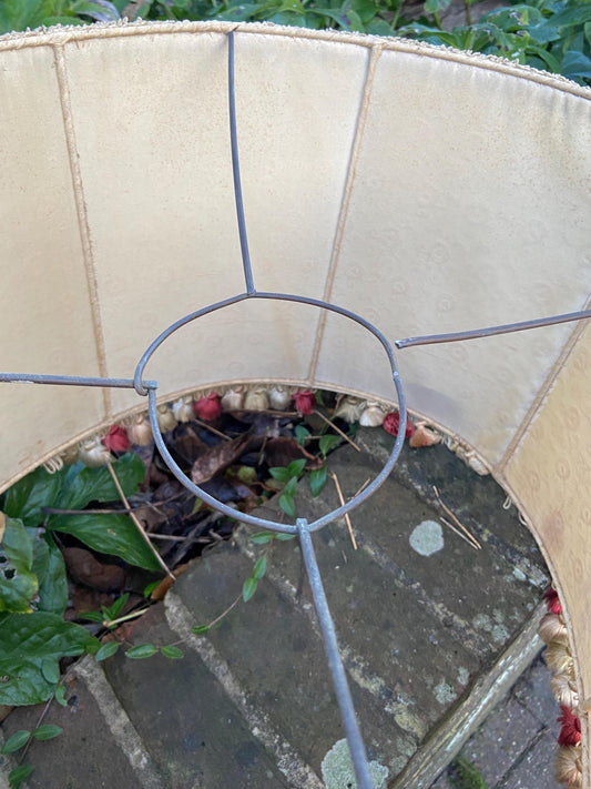 20% OFF AT CHECKOUTRegular price £38.00 GBPRegular priceUnit price / perSale price £38.00 GBP20% OFF AT CHECKOUTOriginal retro lamp shade in golden cream jacquard material, ribbon detail and fringe - VGC