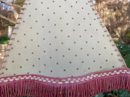 20% OFF AT CHECKOUTRegular price £295.00 GBPRegular priceUnit price / perSale price £295.00 GBP20% OFF AT CHECKOUTVintage 1920s Cream Mica or Celluloid Table Lamp Shade with Gold Polka Dots, Pink Thread, and Fringe – unusual shape with Curved Sides
