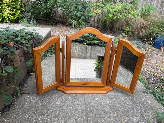 20% OFF AT CHECKOUTRegular price £495.00 GBPRegular priceUnit price / perSale price £495.00 GBP20% OFF AT CHECKOUTVintage pine triple vanity mirror, rustic dressing table trifold mirror with arched centre and hinged side panels, 1980s pine mirror