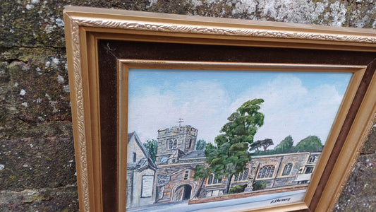 St Mary Church, Finchley original oil painting framed in gilt and velvet vintage frame 29cm x 33.5cm