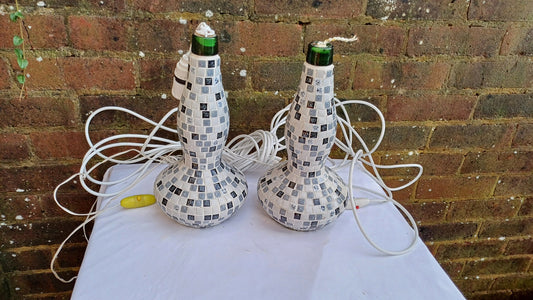 20% OFF AT CHECKOUTRegular price £275.00 GBPRegular priceUnit price / perSale price £275.00 GBP20% OFF AT CHECKOUTSuperb Pair of Mosaic on Glass Bottle Handmade Bedside Lamps. Great condition. Lots of flex but need rewiring. Black White Grey..