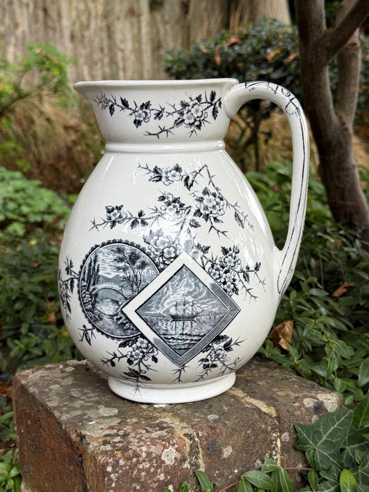 20% OFF AT CHECKOUTRegular price £85.00 GBPRegular priceUnit price / perSale price £85.00 GBP20% OFF AT CHECKOUTLarge Antique c 1880s Pottery Jug/Vase - white pottery with Black Transfer Prints - Americana with Baltimore stamped on underside. Americana