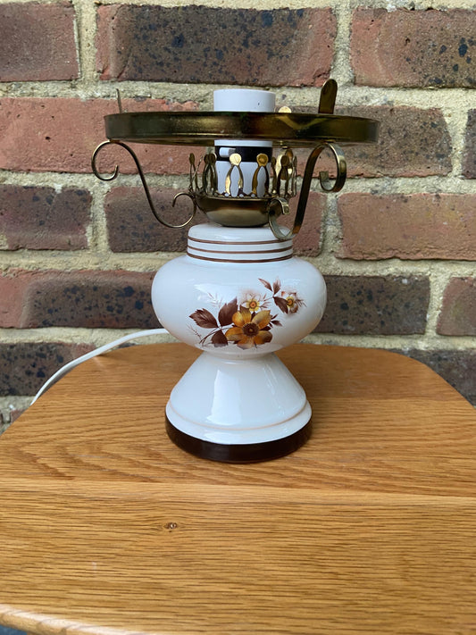 1970s mock Victorian oil lamp in white ceramic, brass shade holder and vintage floral motif - working condition