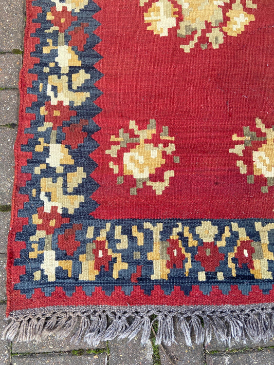 20% OFF AT CHECKOUTRegular price £95.00 GBPRegular priceUnit price / perSale price £95.00 GBP20% OFF AT CHECKOUTVintage large kilim rug in red, dark blue/black - character rug 144cm x 89cm