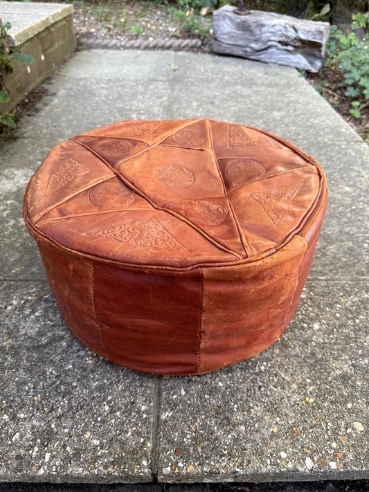 20% OFF AT CHECKOUTRegular price £98.00 GBPRegular priceUnit price / perSale price £98.00 GBP20% OFF AT CHECKOUTVintage Leatherette Moroccan-Style Pouf – Embossed Tan Footstool with threaded Base, rustic and comfy