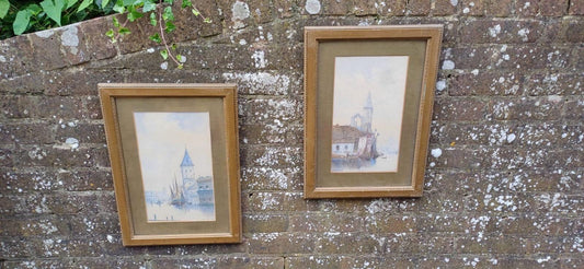 Vintage original watercolours of VENICE. Townscape scenes and water. Signed. Pair of paintings framed in gold painted vintage frames