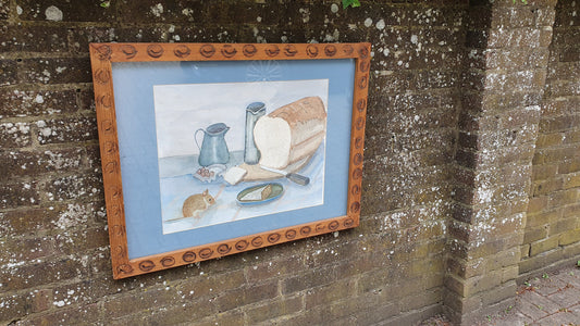 20% OFF AT CHECKOUTRegular price £38.00 GBPRegular priceUnit price / perSale price £38.00 GBP20% OFF AT CHECKOUTVery Large Bold and Imposing 70’s or 80’s Quirky Still Life Watercolour Cheese Wine and Mouse. 82 x 64 cm.