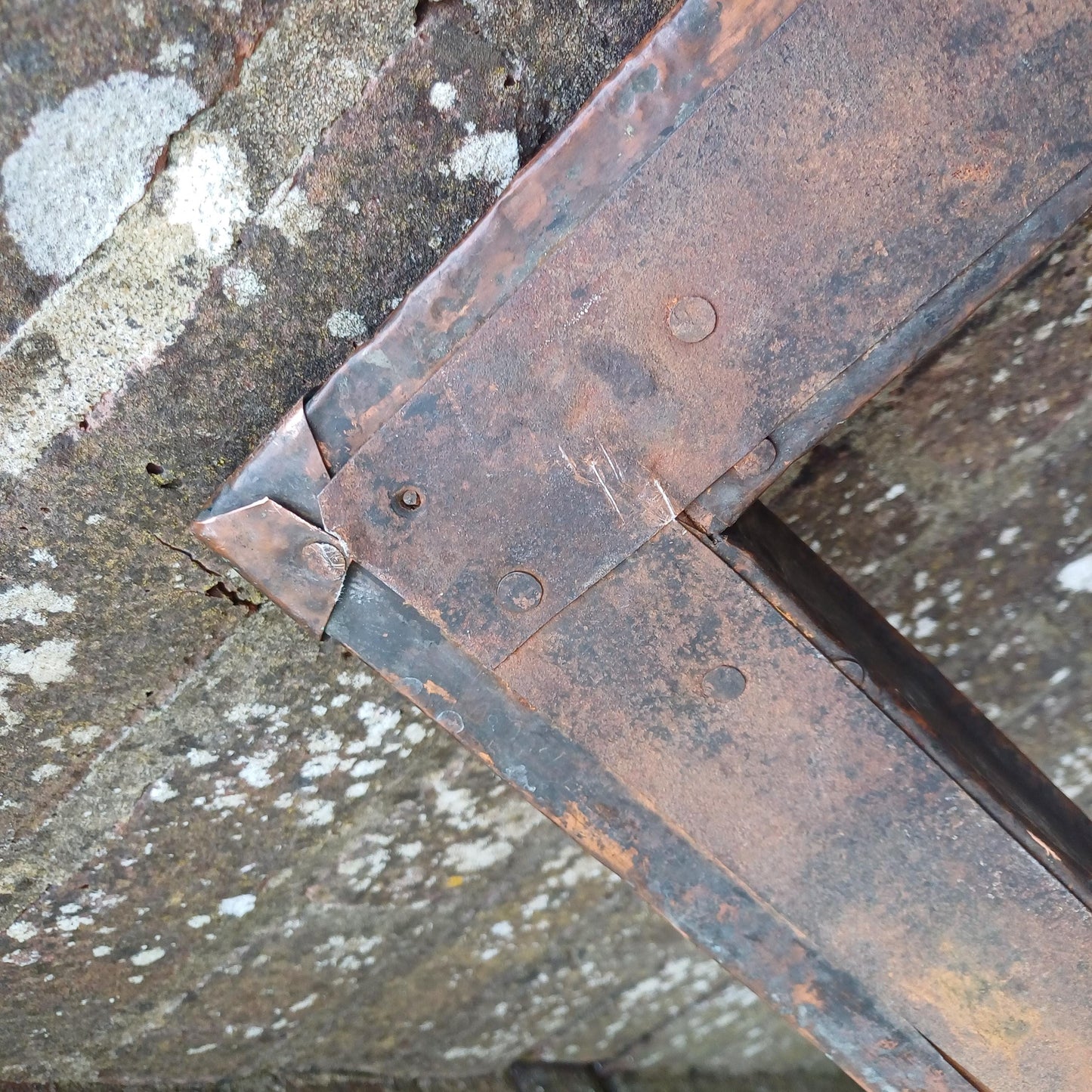 It remains in solid, intact condition, with wear consistent with its age and use. The surface shows varied dark and greenish oxidation, which many collectors find desirable as it speaks to the piece’s authenticity. The embossing is still sharp and well-defined, with intentional hammering marks adding to its character. There is some very minor separation at a few seams where the copper meets the wood, but overall, the structural integrity is very good.