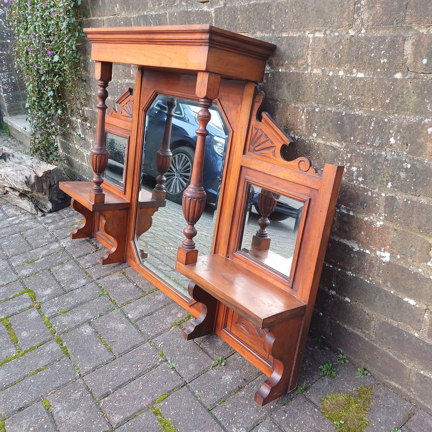 The mirror has a three-panel configuration, with a large central bevelled octagonal mirror flanked by two smaller square mirrors. Each side panel is adorned with turned columns and decorative floral fan carvings. The two shell sections on either side suggest it was designed to be used as a whole piece, possibly above a fireplace, making it perfect for displaying small items like candles or ornaments.