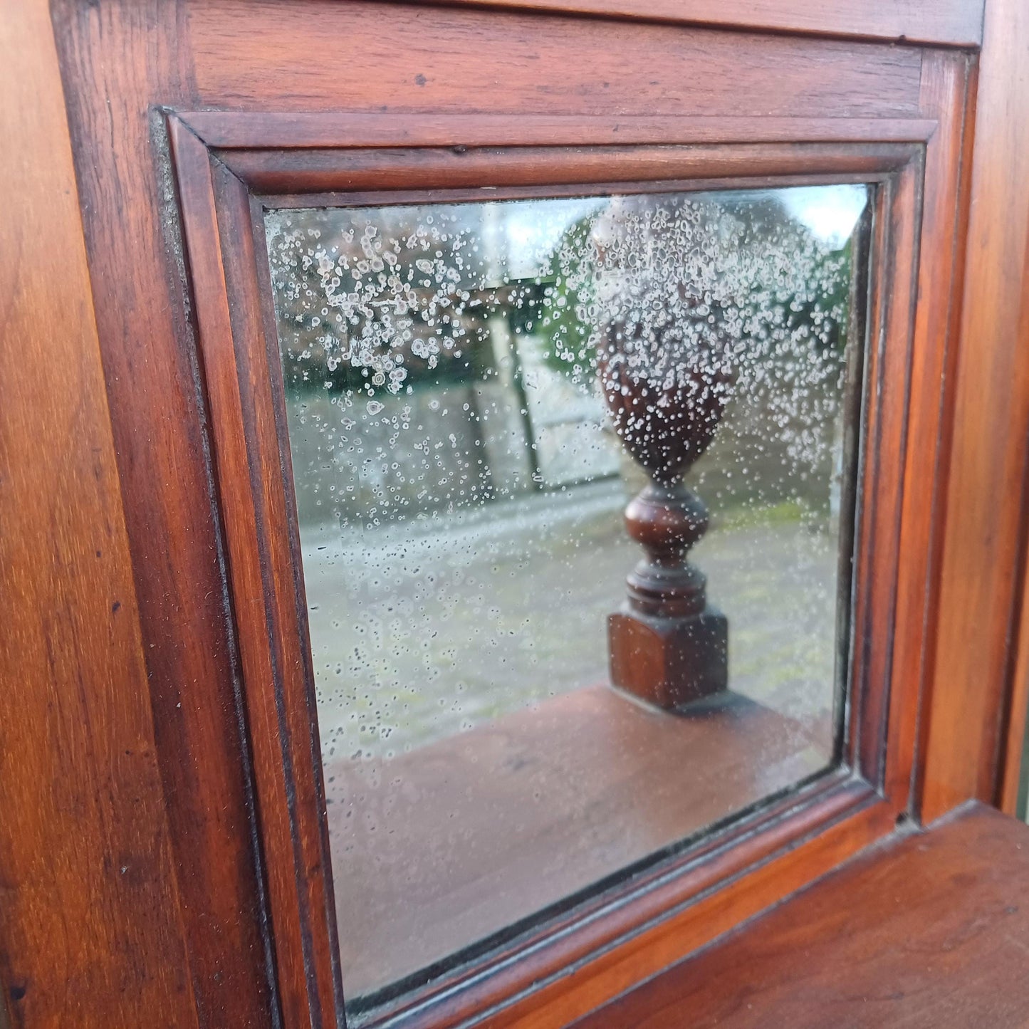 Otherwise, the other glass is well preserved. There were two finials on the top right and left, which are now missing. There is a small piece of wood missing where the left-hand finial was, and a hole where the other was screwed in. However, when viewed from a normal angle, the missing piece is not noticeable. You can see this in the images.