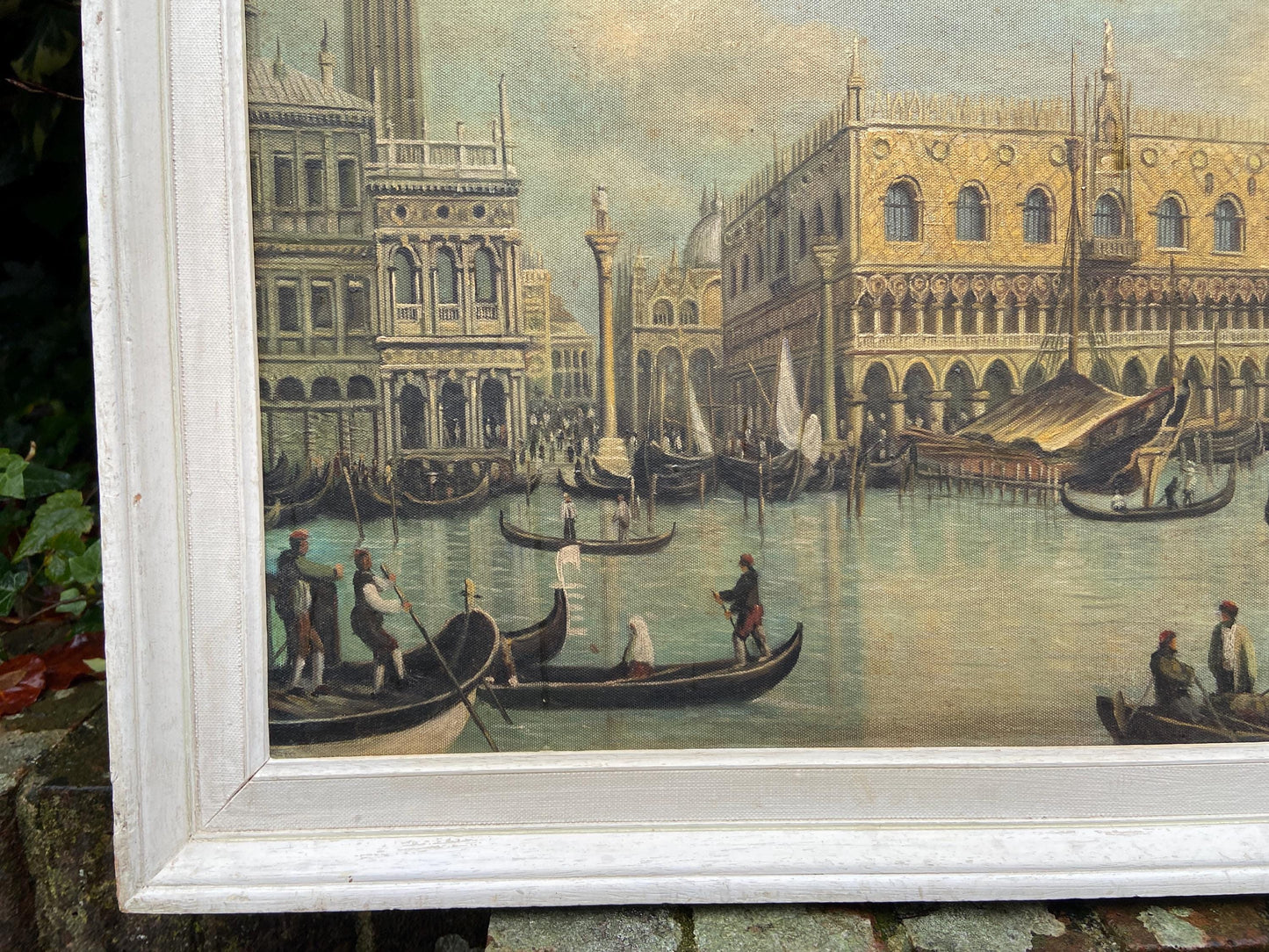I wish I knew who the artist A.P. was. They have completed a wonderful copy of the famous Canaletto painting "Veduta del Palazzo Ducale di Venezia". They have done an oil on board, and then had it framed in a white wooden retro frame. Given the frame age, it looks like this was completed in the 1970s. It is really quite an exemplary copy of the original.