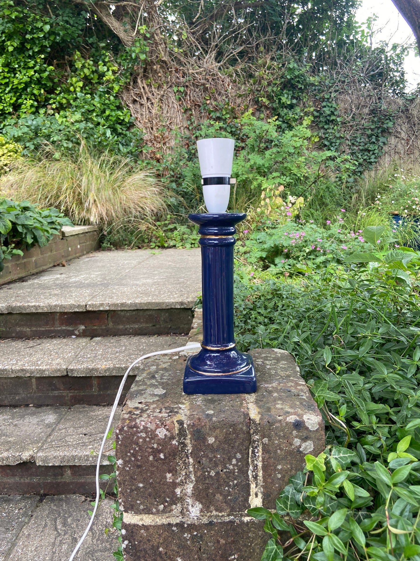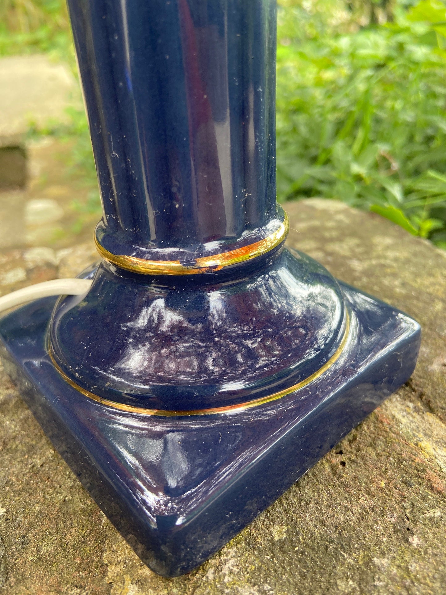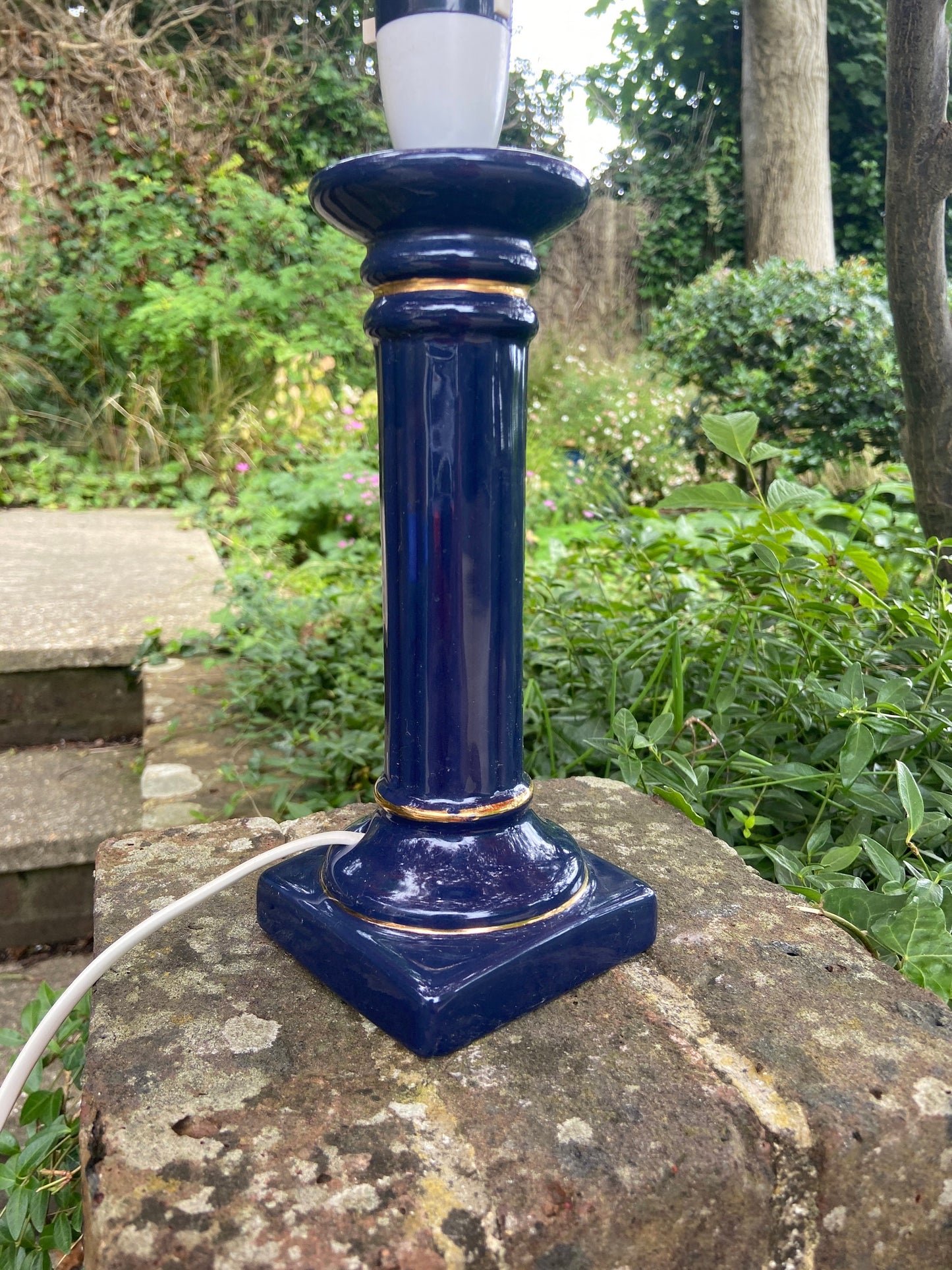 Classic 1990s vintage navy blue table lamp - blue and gold ceramic, working, candlestick holder style, stick lamp
