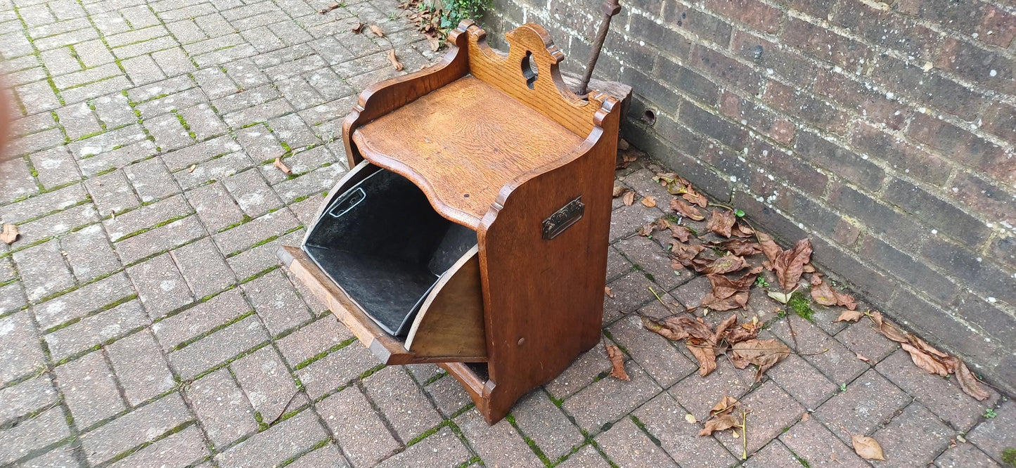 Crafted from solid oak, the scuttle has a rich, warm tone with visible wood grain, showcasing the high quality of the craftsmanship. Oak is a durable, strong material, often used for its robustness and natural beauty in functional items from this period.