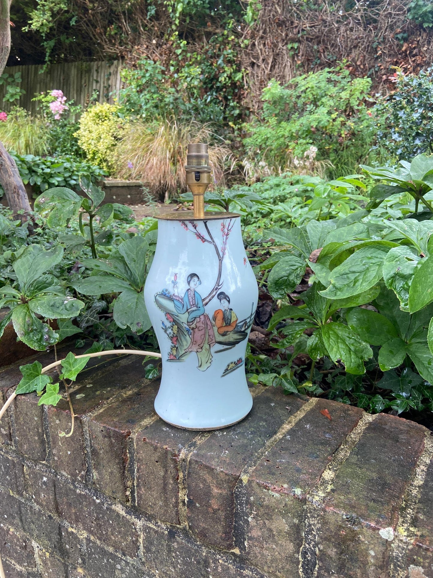 There are so many oriental / Asian vintage lamps on the market, but this one is a little more special. Not the classic ginger jar style lamp either. It is made out of porcelain, quite thick porcelain and is hand painted. It is likely from the Early 20th century. It appears to have Japanese influence rather than Chinese/Mandarin. Lovely depiction of two ladies on the front, with writing on the back. Brass lid at the top. There are production 'issues' with it too, making it wonderfully authentic eg. speckles of paint in odd places. There is also some minor and not noticeable damage - a small chip under the brass lip in one place and a fine crack in another.