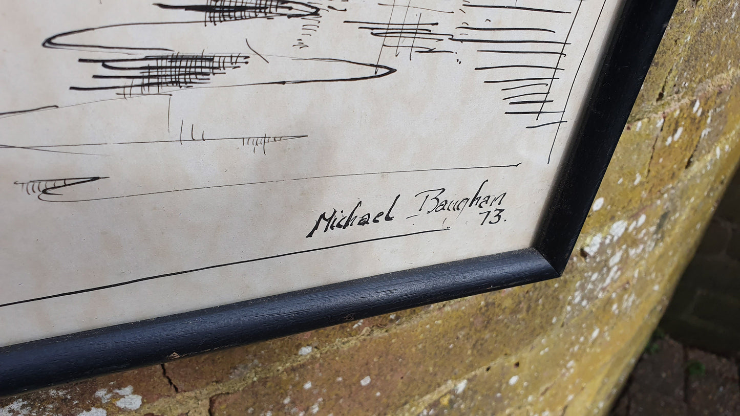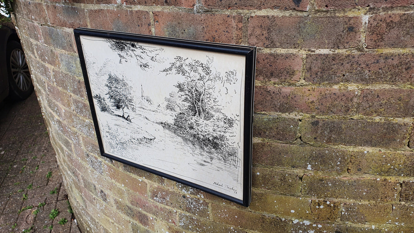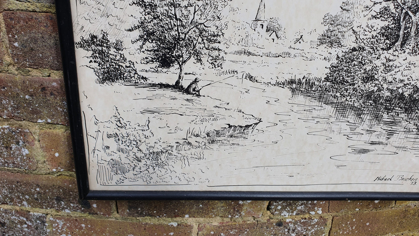 Lovely etching of a bucolic country river scene, signed Michael Baughan 73. I think it is a print but it may be the original etching. It is in a period black wood frame with two white lines on the outer edge.