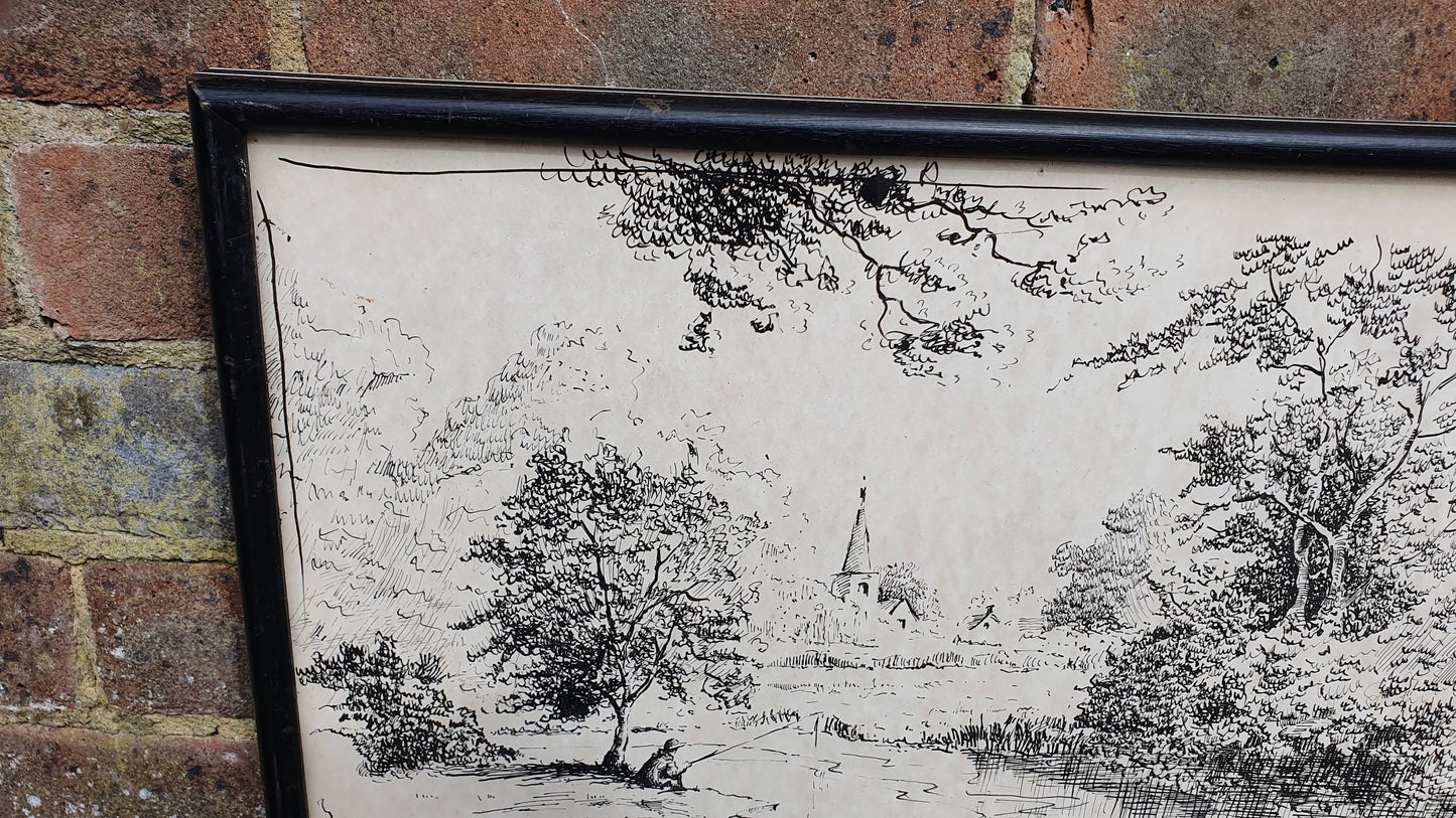 English Landscape Art Print Black & White Etching Countryside River Fishing Vintage Black Wood Frame