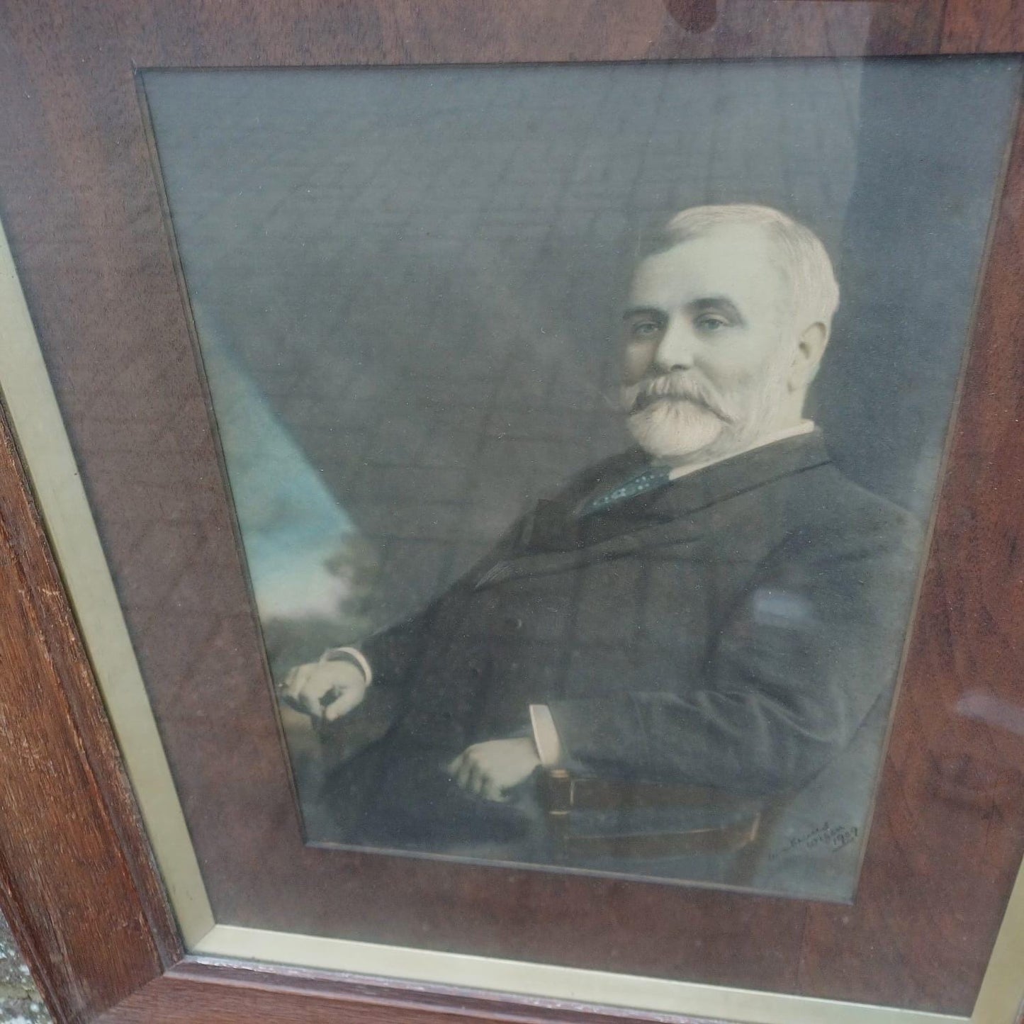 Delightful tinted (greys, blacks and blues) photograph of a distinguished Edwardian gentleman. Not sure who he is, but he is photographed by William Skewes, a well known photographer in Wigan, Lancashire. It was take in 1909 and is signed. A very proper antique photo in a wonderful, unusual oak frame. Solid oak outer frame, with an inner wooden mount and silver finish. Glazed, solid backing and wiring – ready to hang.