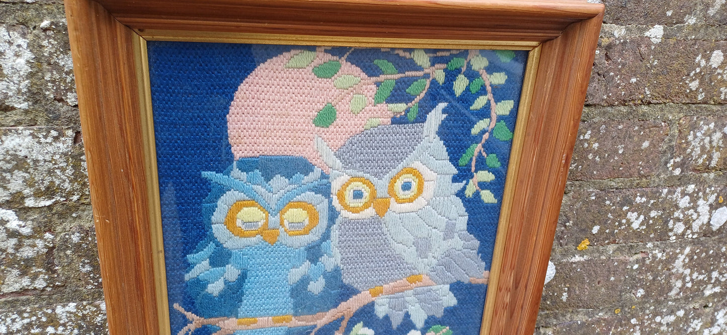 Framed vintage tapestry - woollen - pair of Owls; lovely blue colours; vintage tapestry needlework vintage embroidery; vintage craft work