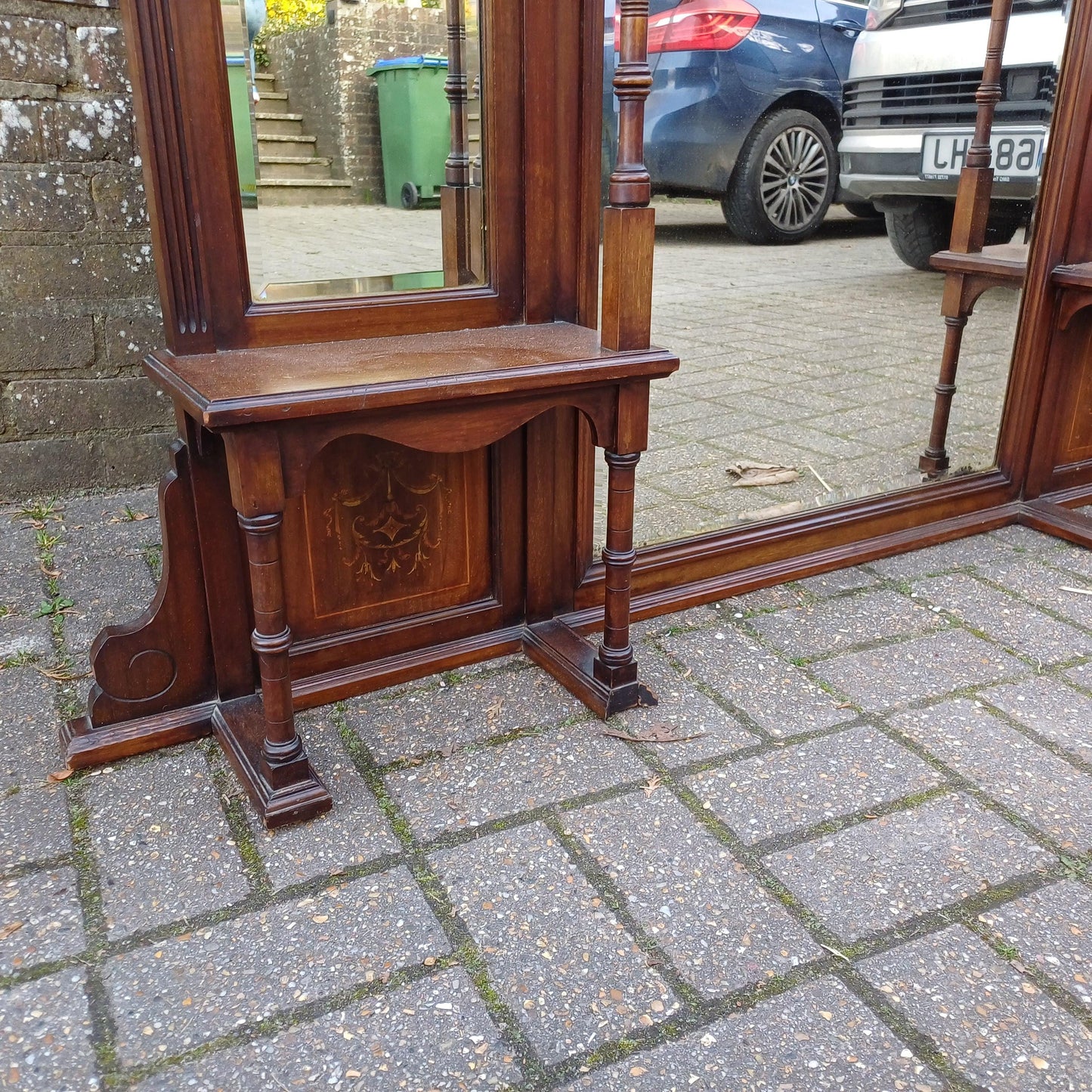 Crafted from mahogany or walnut, this grand mirror is adorned with elegant floral marquetry inlay and decorative carvings. It features three mirrors a large central one flanked by two narrow side mirrors, along with charming miniature tiered display shelves supported by turned spindles. This magnificent piece would elevate any period interior, making an ideal focal point for a hallway, dining room, or above a mantelpiece.