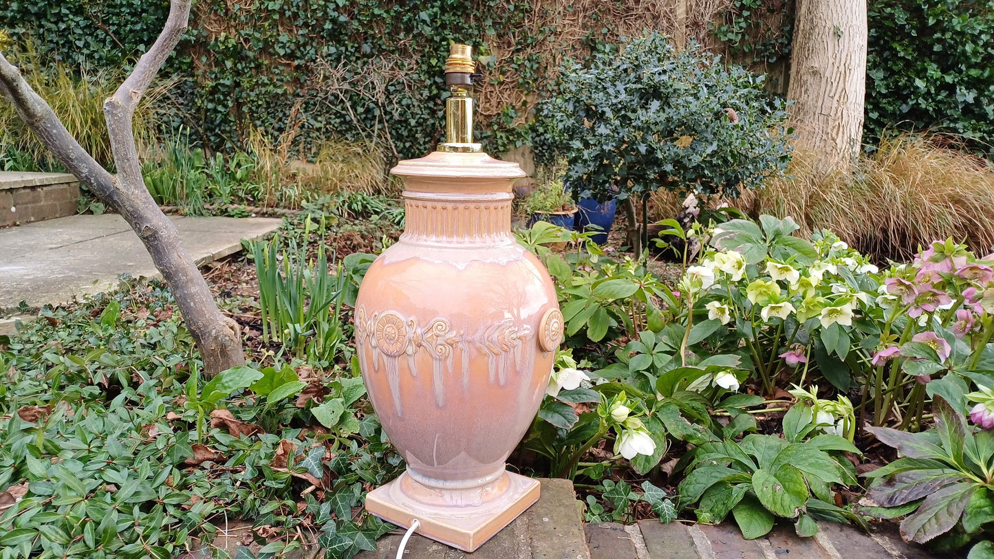 Huge Heavy Ceramic Lamp Glazed Pottery Lustre Finish and Glaze. Pleated Silk Effect Lampshade.