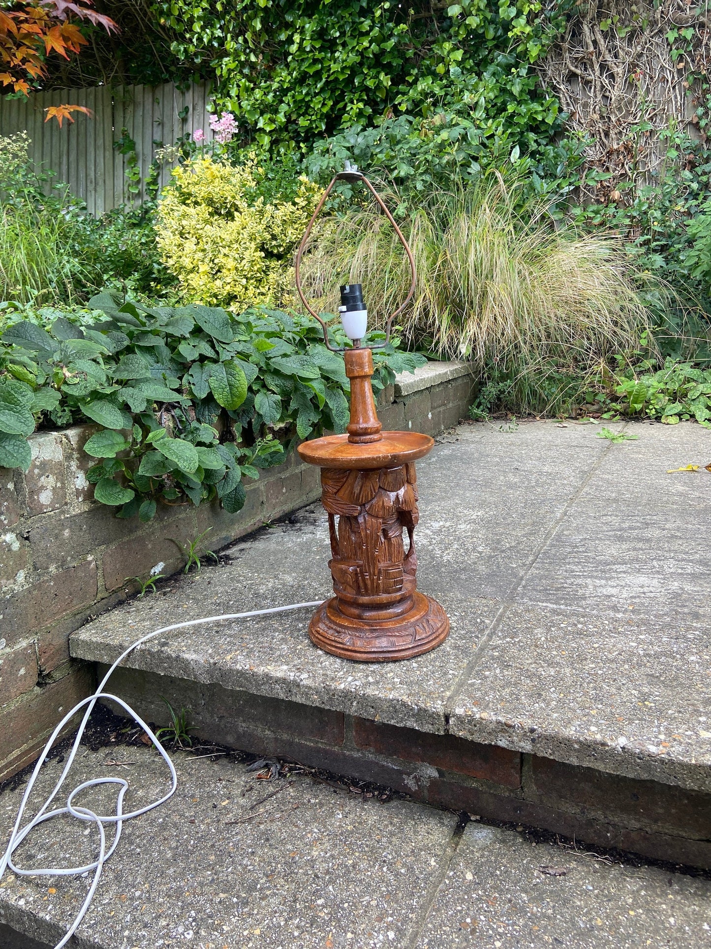 This is a super bit of carved woodcraft - making a lovely table lamp with a bit of unique quirk and ethnic charm. Very likely made abroad - I would say Asia or Pacific area given the subject matter of the carving. Carving detail includes patterns of course, but also trees, a village hut and likely a villager at work. It has been kitted out with flex and a bayonet fitment, and a lampshade holder (pls note I may remove this for packing and delivery). The carved base has been stained/varnished at some point and the stain has got markings on it in places you would expect eg the rims and edges. I haven't re stained these as you might like this more rustic look. Similarly, I have given the lamp a good clean, but I am not saying I have been able to clean it up perfectly. The metal lampshade holder is rusty. The current plastic bayonet fitment is missing its top piece, as the lampshade would sit on the wire frame - but you may wish to remove the wireframe and use a standard lampshade fitment. These are easy to buy or find it a charity shop etc. With a large bold shade, or maybe something a bit earthy like bamboo/wicker shade, this lamp will come alive and display its wonderful handcraft. Please note this lamp is working but its wiring has not been tested or upgraded.