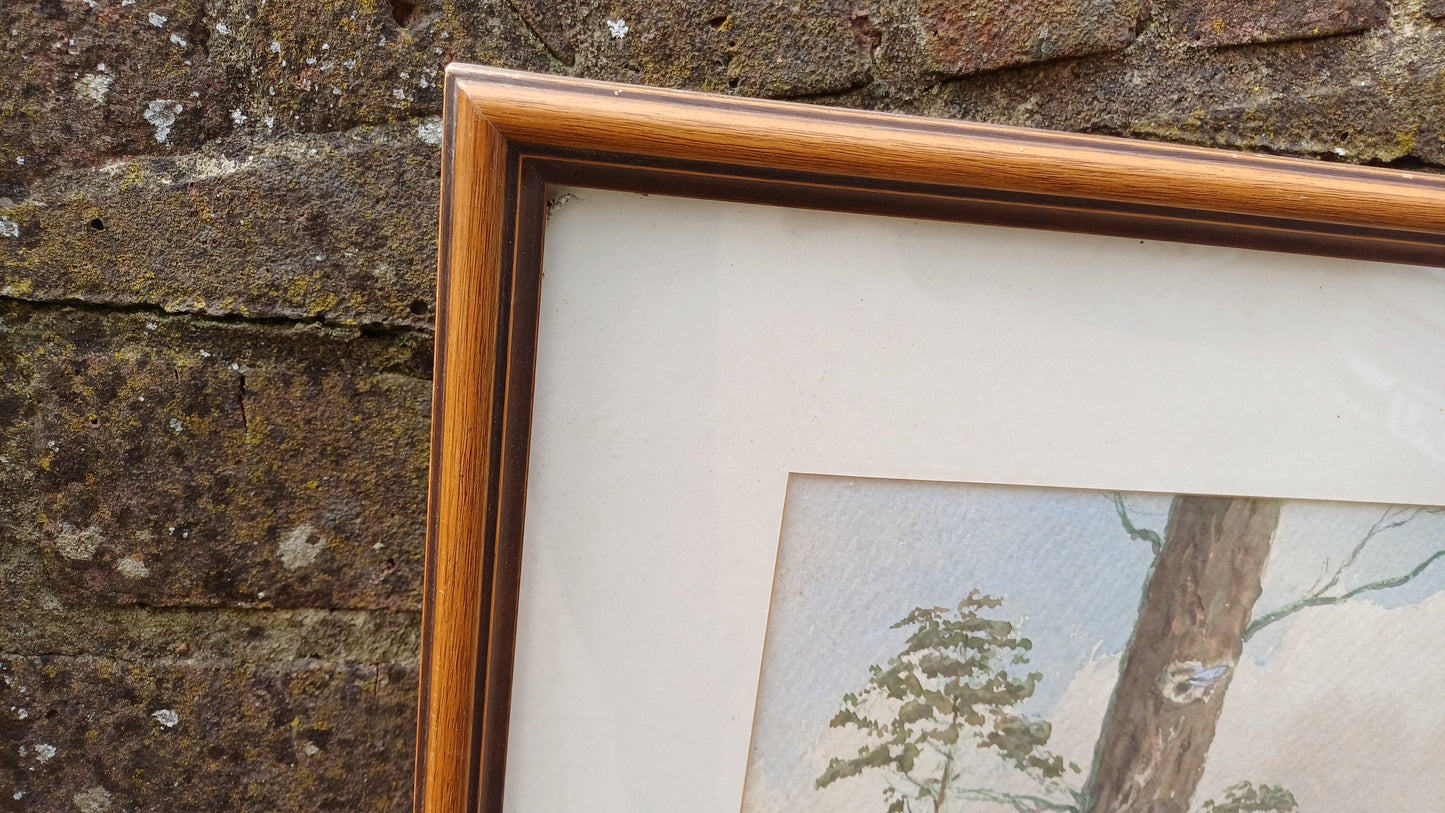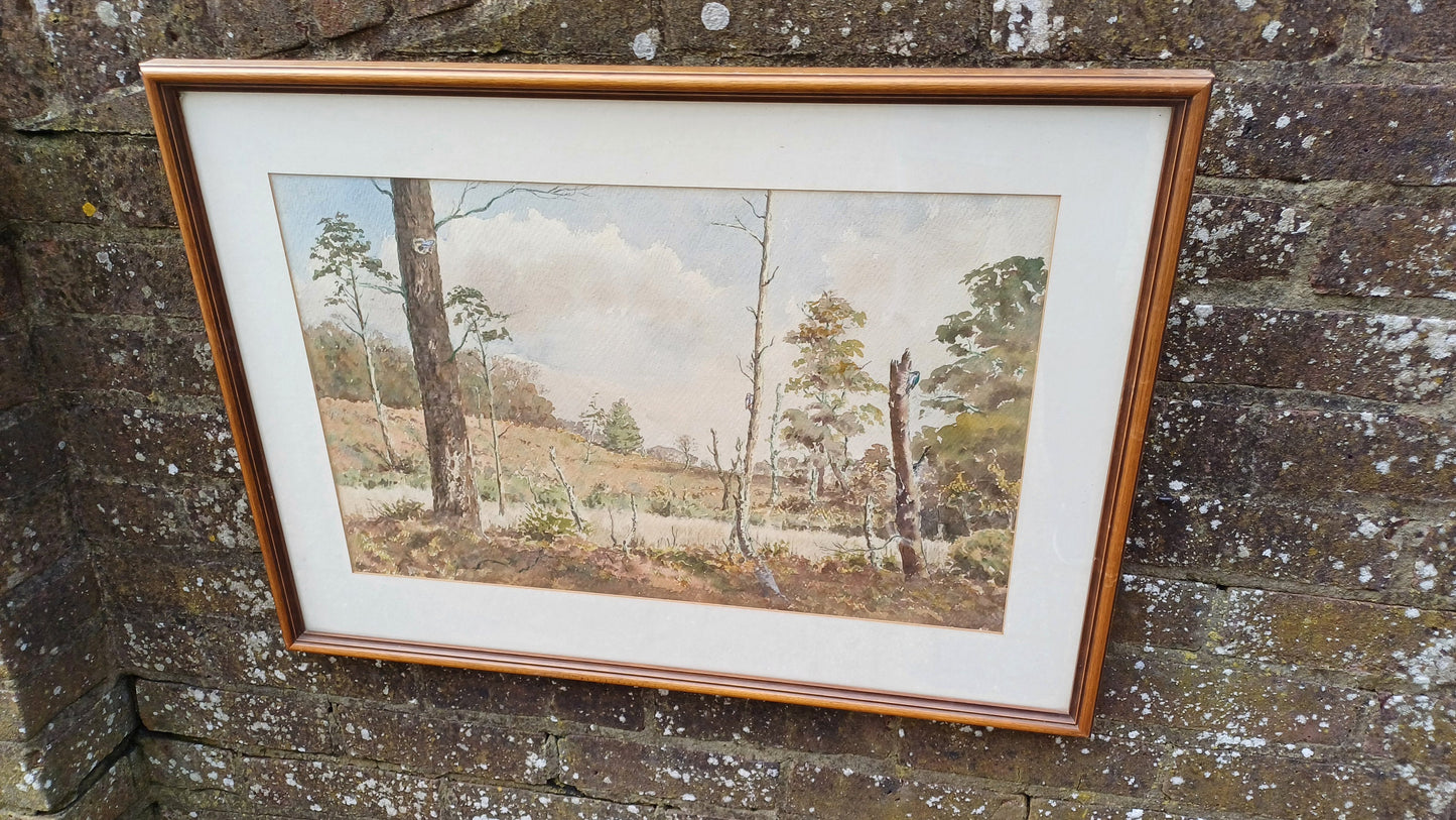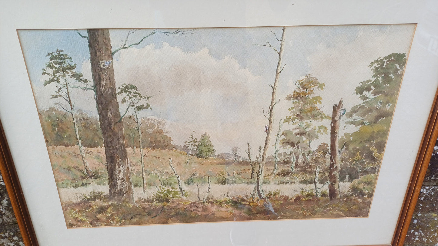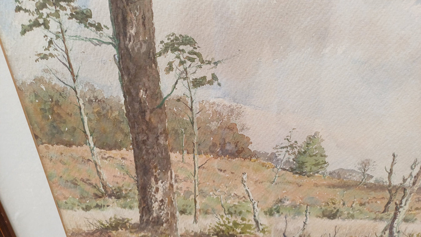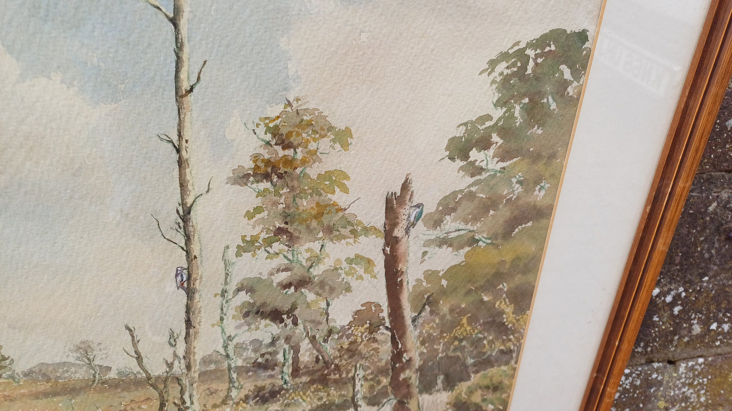 Large original vintage watercolour of a country scene, woodland, moorland, forest - Ashdown Forest possibly, cuckoos, mounted, glazed framed