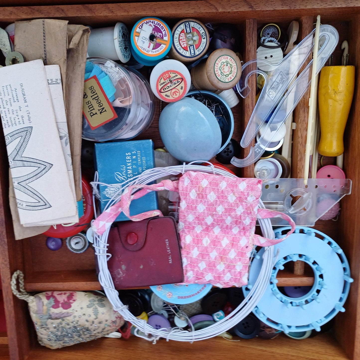 Interior: Includes a sliding compartment, ideal for storing sewing accessories, crafts, or small treasures. (Contents of the compartment will be included upon purchase.)