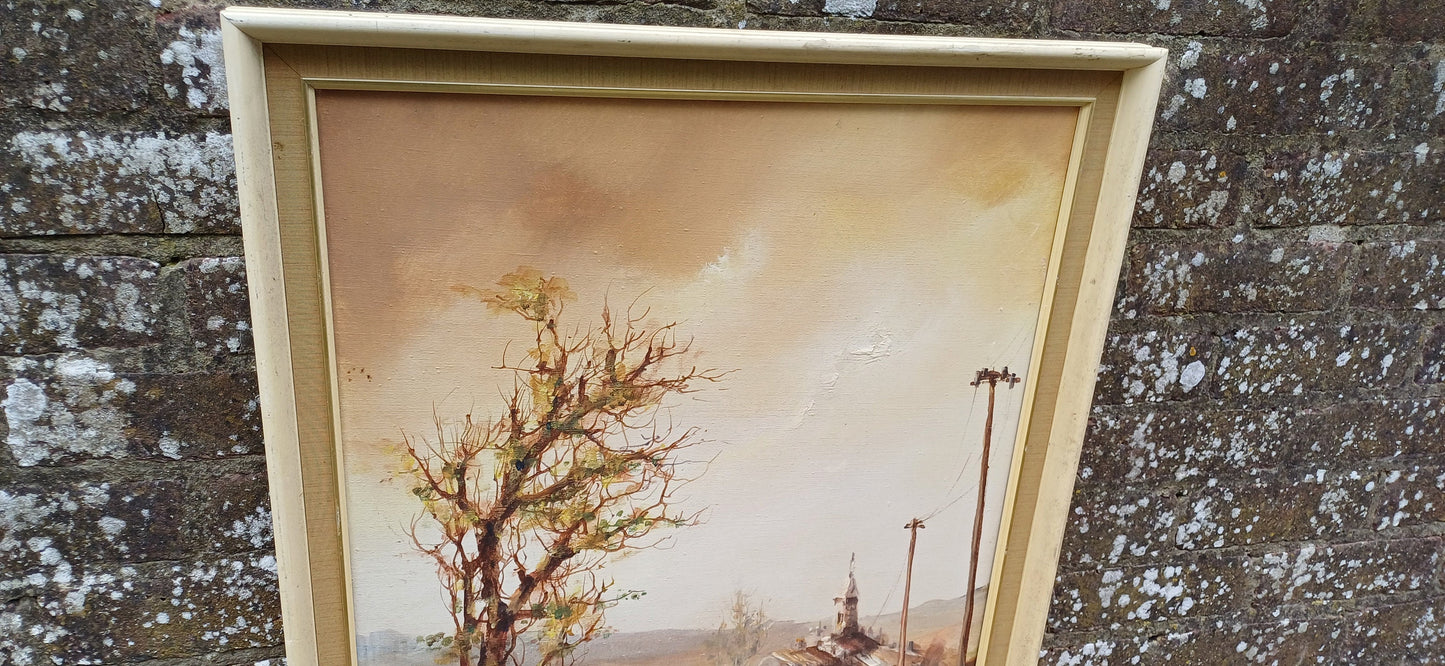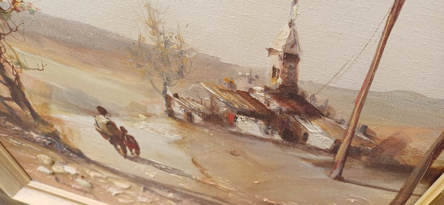 Original vintage retro large painting - oil and mixed media painting, signed painting in retro frame, children and village scene