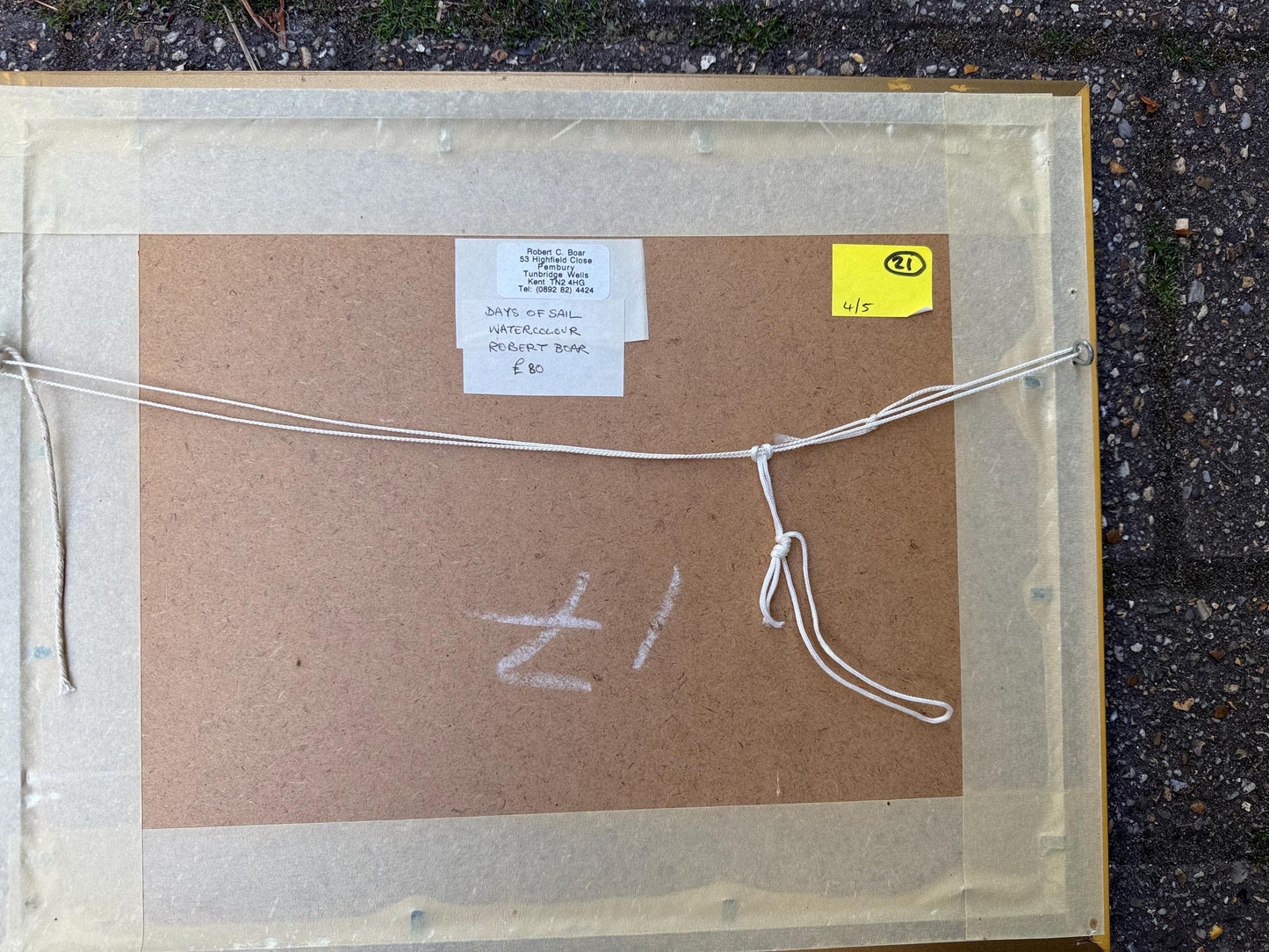 This original work is signed in the lower right corner by Robert Boar, a lesser-known yet highly skilled artist likely active in the mid-to-late 20th century, known for his maritime and coastal scenes. The painting is presented in its original gold-toned frame with double mount and protective glass, ready to hang.