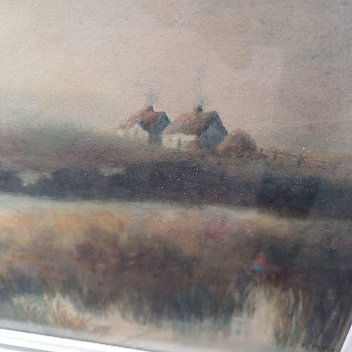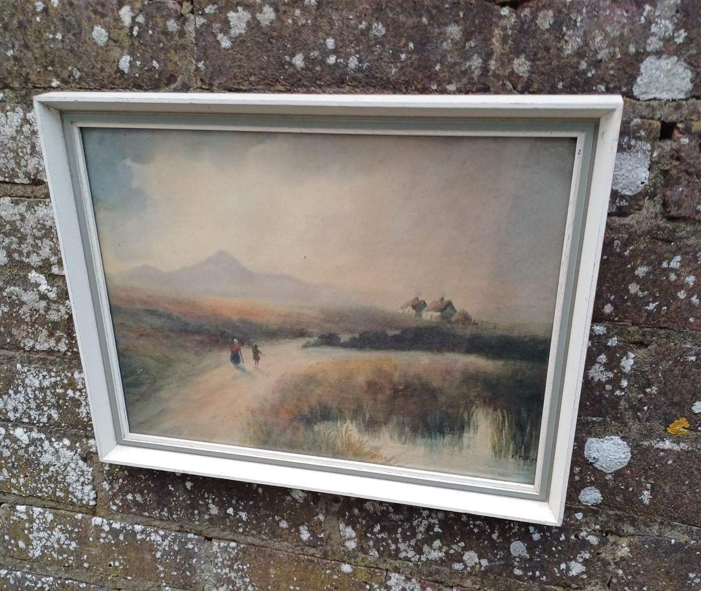 Wonderful wintery, sensual water colour painting by British 20th century artist, K.M. Boyd. Is signed on the painting and on the rear it has a handwritten label which says "Down a country lane in County N". Which County N could it be referring to? Clearly one with some mountains, and lots of rural landscape - totally beautiful. You can imagine the conversation between the adult and the child as they return back to the cottages with firewood. Probably looking forward to a brew and warming up by the fire. The colours are muted and bring the cold air an country life to life. In a glazed vintage white wooden and grey frame. Ready to hang.