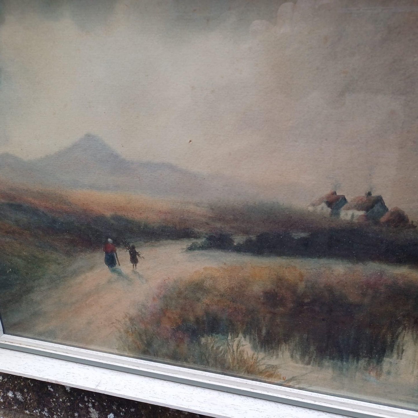 Rare K.M. Boyd vintage watercolour - "A country lane in County N" early 1900s, mountainous landscape painting in wonderful glazed frame