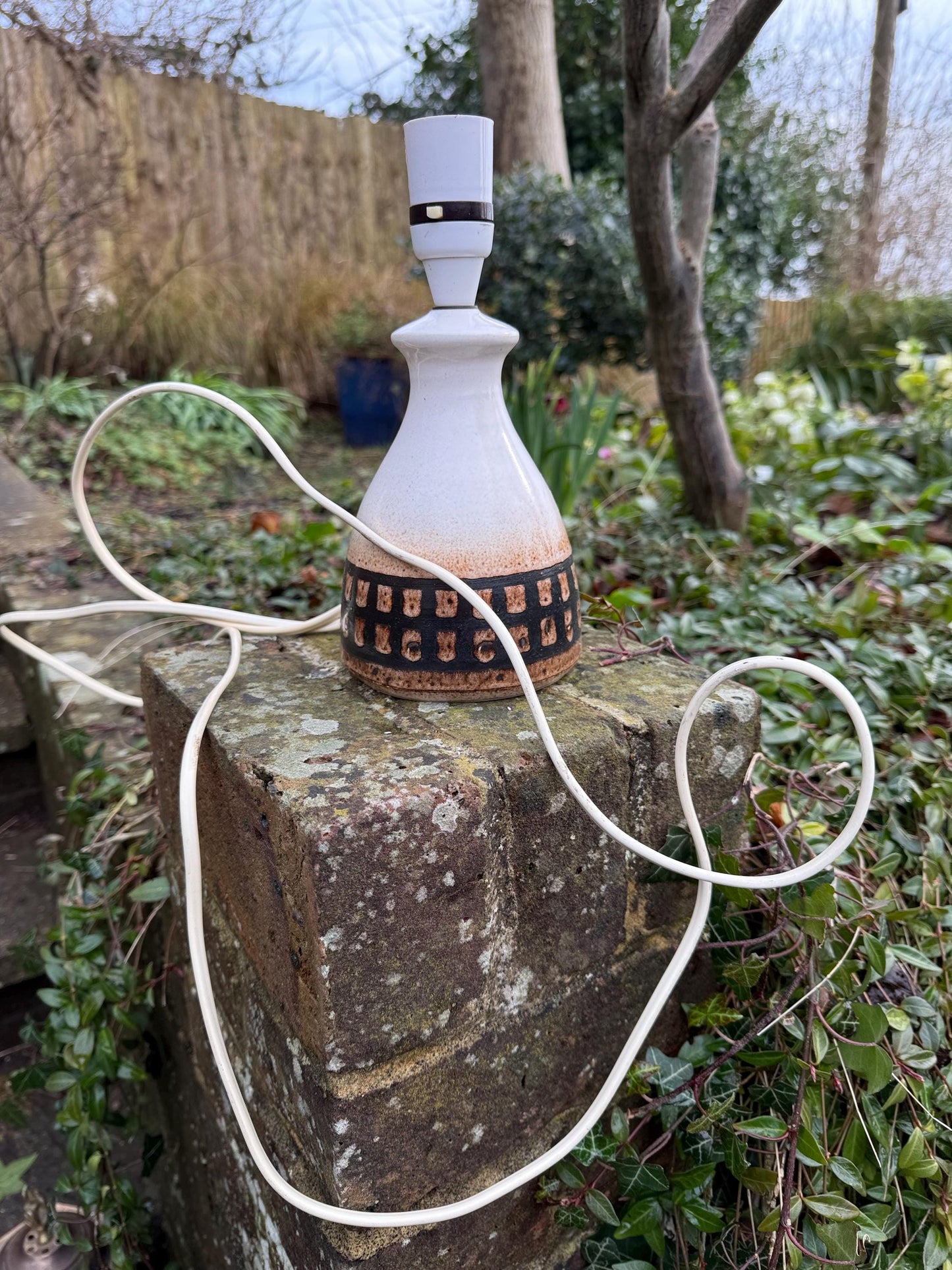 A smashing retro vintage pottery stoneware lamp made by Iden Pottery in Rye. In excellent condition. Handcrafted and handpainted. Wonderful creamy base with browns and beiges in a very retro pattern and glaze at the bottom. Stamped underside. Tested and working. No chips, cracks or crazing. Excellent little lamp.