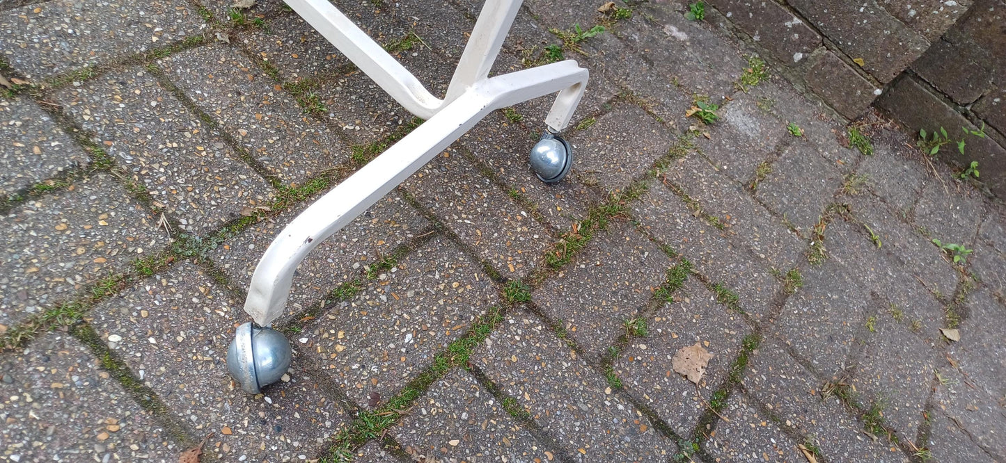 This vintage industrial-style full-length dressing mirror is both practical and stylish, offering a classic utilitarian design that evokes mid-century shop displays or studio fittings. Set within a robust white/cream painted steel frame, the mirror tilts for optimal viewing angle and sits securely within an A-frame support on four sturdy castor wheels, making it easy to manoeuvre and reposition as needed. The mirror itself is tall and narrow, providing a full-length reflection ideal for dressing rooms, fashion studios, home interiors, or vintage-inspired retail spaces.