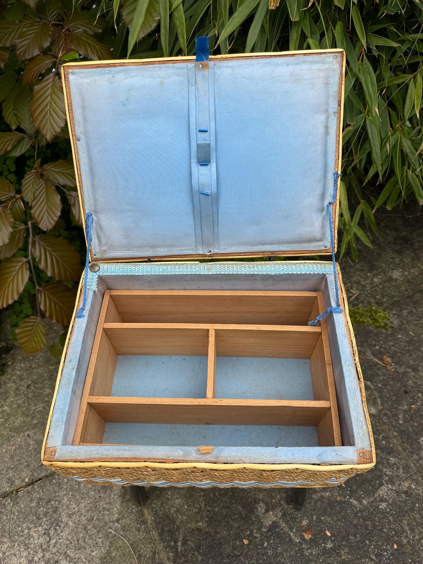 Vintage mid-century wicker sewing box on metal capped tapered legs, retro craft storage, with blue lid and metal tipped legs, 1950s workbox