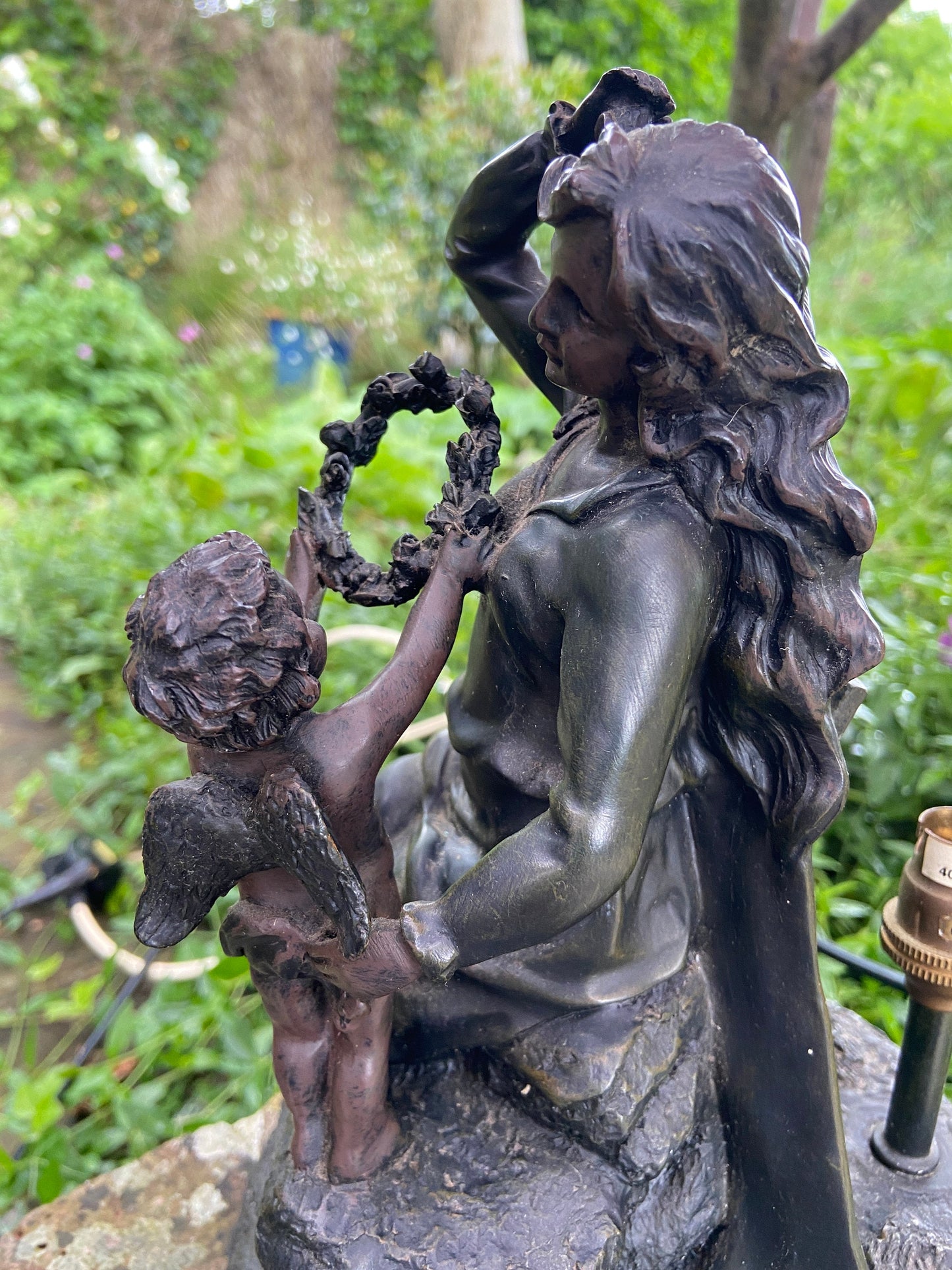 A very lovely vintage Widdop Bingham & Co statue / figurine lamp. Black with metallic tinge - bronze like finish - statue of woman and cherub / angel. The woman is sitting gracefully on a rock, and the cherub is looking up to hari and looking to place a headpiece/ wreath on her head. It is a lovely moulded cast lamp base - figurine. Lamp does work but it is missing its shade which I think would have sat at teh back of the figurine. However maybe not? The lamp has had additional wire/flex added to it over the years - personally I would take it back to the original black wire and move the plug. It has a working on off switch and takes a small size bayonet bulb. I love this figurine lamp - either as a lamp or as a statue. Very angelic and attractive to look at. Besides the missing or not missing shade, this lamp base is in very good condition. No chips etc. Please have a look at the photos and the video.