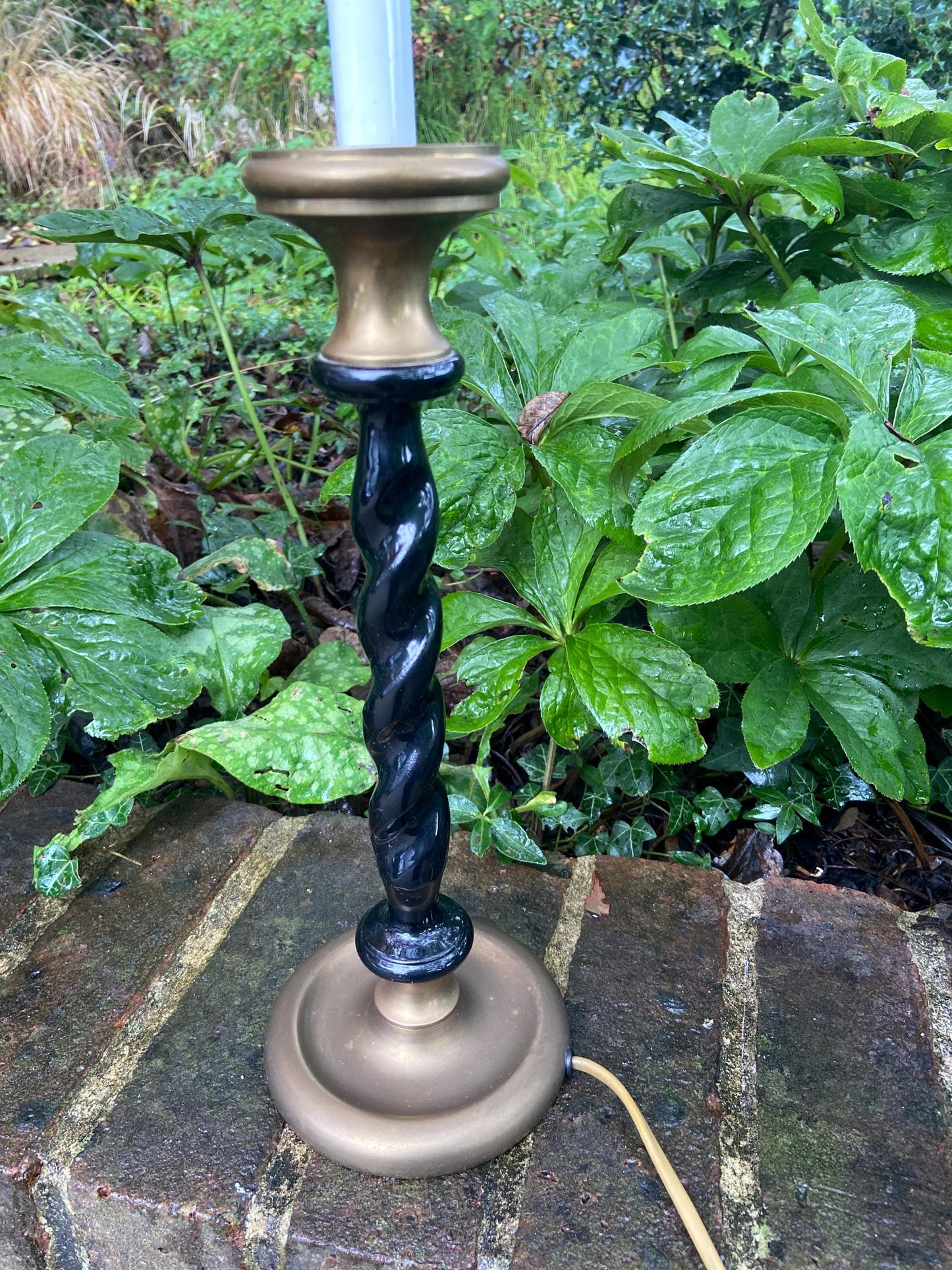 Delightfully elegant and great quality 1980s table lamp. Late retro and definitely vintage. Made out of quality metal, possibly brass, with a ceramic/china spiral stem in black. Quite heavy which is good for stability purposes. Mock candlestick design so often known as 'stick style'. The white top of the stem representing a mock candle, the large round base and spiral stem representing a candlestick holder. There are only the smallest signs of age and wear on this lovely vintage lamp. Would look smashing with a great big shade - traditional Empire or Bell shape would be good, but so would a cone or drum shape for something more contemporary. Have a blast - this is a great lamp to 'dress up'. Please see photos and video for more info. Please note this lamp is sold as working but has not been professionally reviewed or tested. There is also a join in the cable which is currently taped up in electrical tape. Please see photos etc.